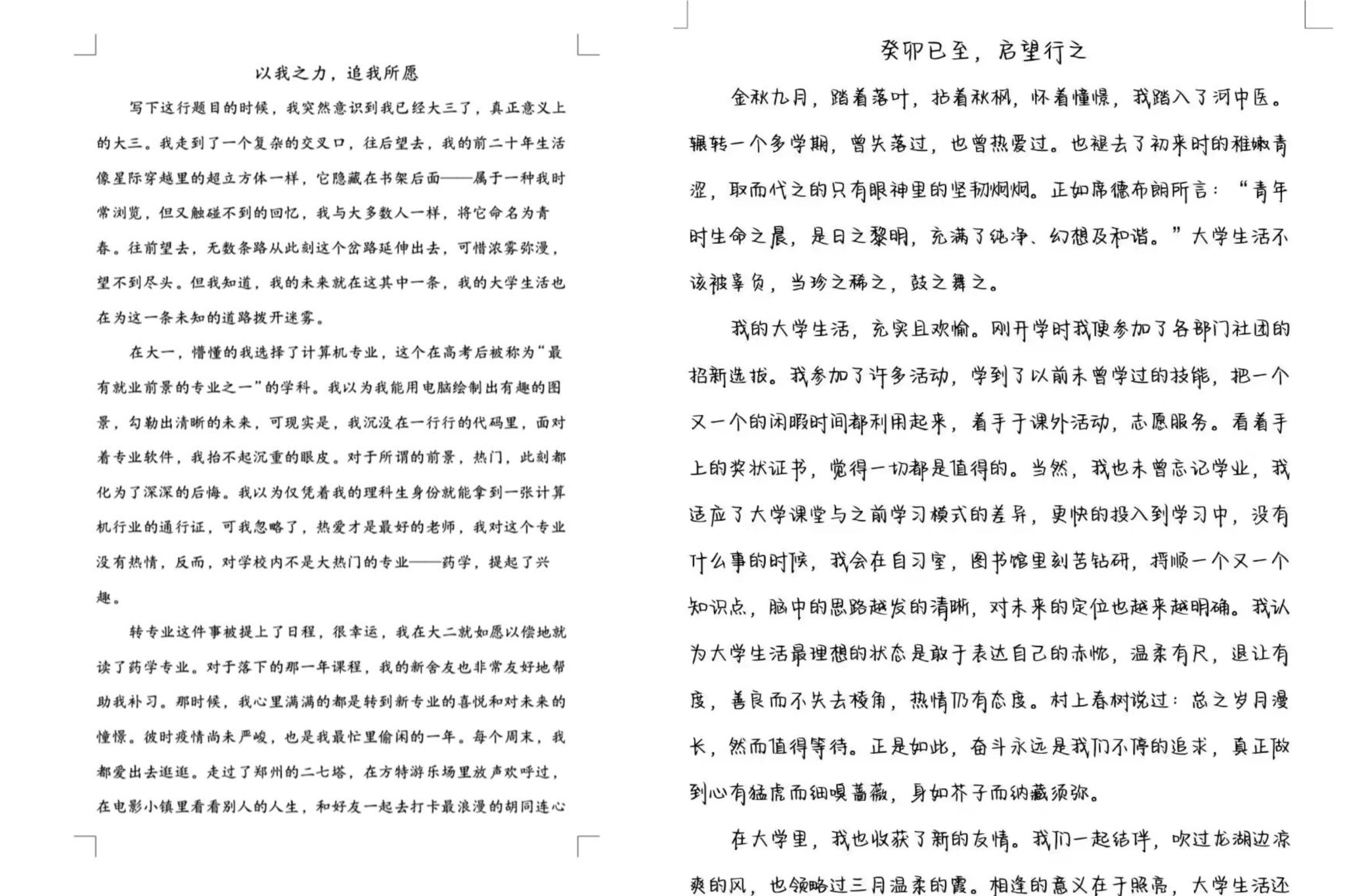 活动一经发布,便得到了同学们的广泛响应和积极参加,纷纷用文笔书撰写下自己对大学生活的感悟。参赛作品充满积极向上的正能量,展示了同学们良好的精神风貌和深厚的思想内涵。其中,2020级药学本科班曹芊然获得本次活动的一等奖。她通过文字娓娓道来了自己在大学时期的迷茫、新冠疫情阴霾下的压力,以及大学生活中收获的感动和成长。
