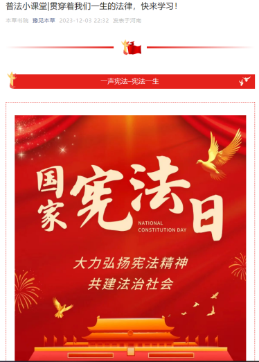 ”微信公众号发表相关推文,更加深刻地使学生了解到宪法与自身一生息息相关;12月4日“国家宪法日”当天,书院学子通过教育部全国青少年普法网、智慧普法平台(中国普法网)等网络在线资源准时收看相关节目,参加“宪法晨读”活动,进一步增强书院学子的宪法意识,使学法、知法、守法、用法深入学子内心,外化于行动之中,自觉成为推广宪法的新时代青年。