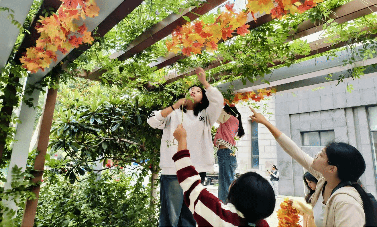 秋风拂过,连廊处的银杏叶与枫叶交织摇曳,如同秋天的“华尔兹”般亲临现场,为平静的社区更添一抹秋韵。在本次活动中,书院学子亲手将落叶标本制作、穿线、安装,不仅丰富了学子们的社区生活,同时通过亲手装饰社区,美化社区环境,增强了学子们与书院社区的情感联系,提升了同学们的幸福感和归属感,有利于书院学子以饱满的主人翁意识参与到社区建设中来,为书院高质量发展贡献力量。