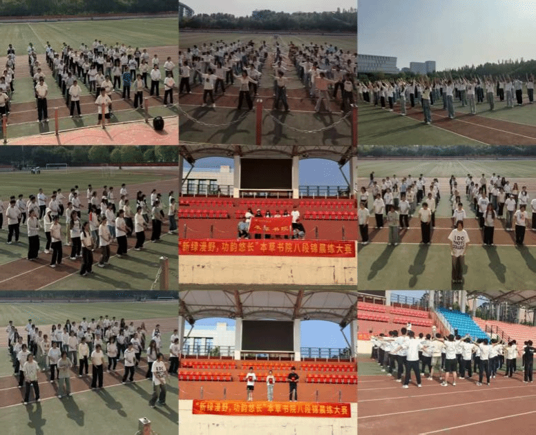 在龙子湖校区东操场举办“新绿漫野,功韵悠长”八段锦比赛,2024级全体学生参与。