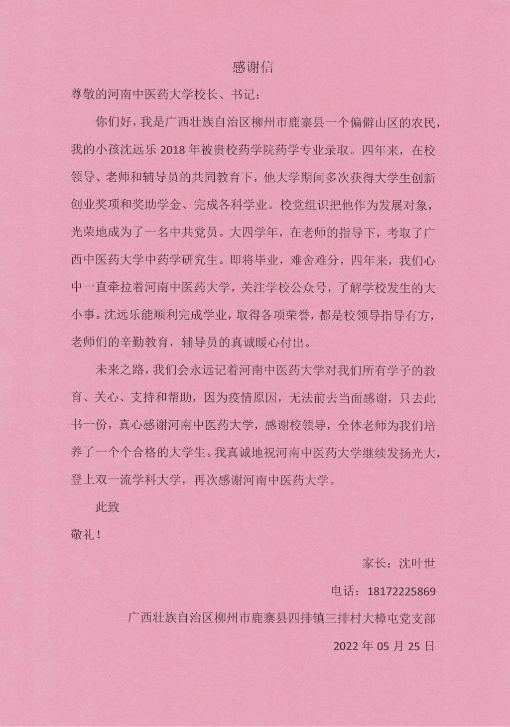 收到了一份特别的礼物,一封来自2022届优秀毕业生药学本科班沈远乐家长的感谢信。信中沈远乐同学家长沈叶世先生对学校四年来给予其孩子的培养和教育表示感谢,为学校未来发展送上美好祝愿。