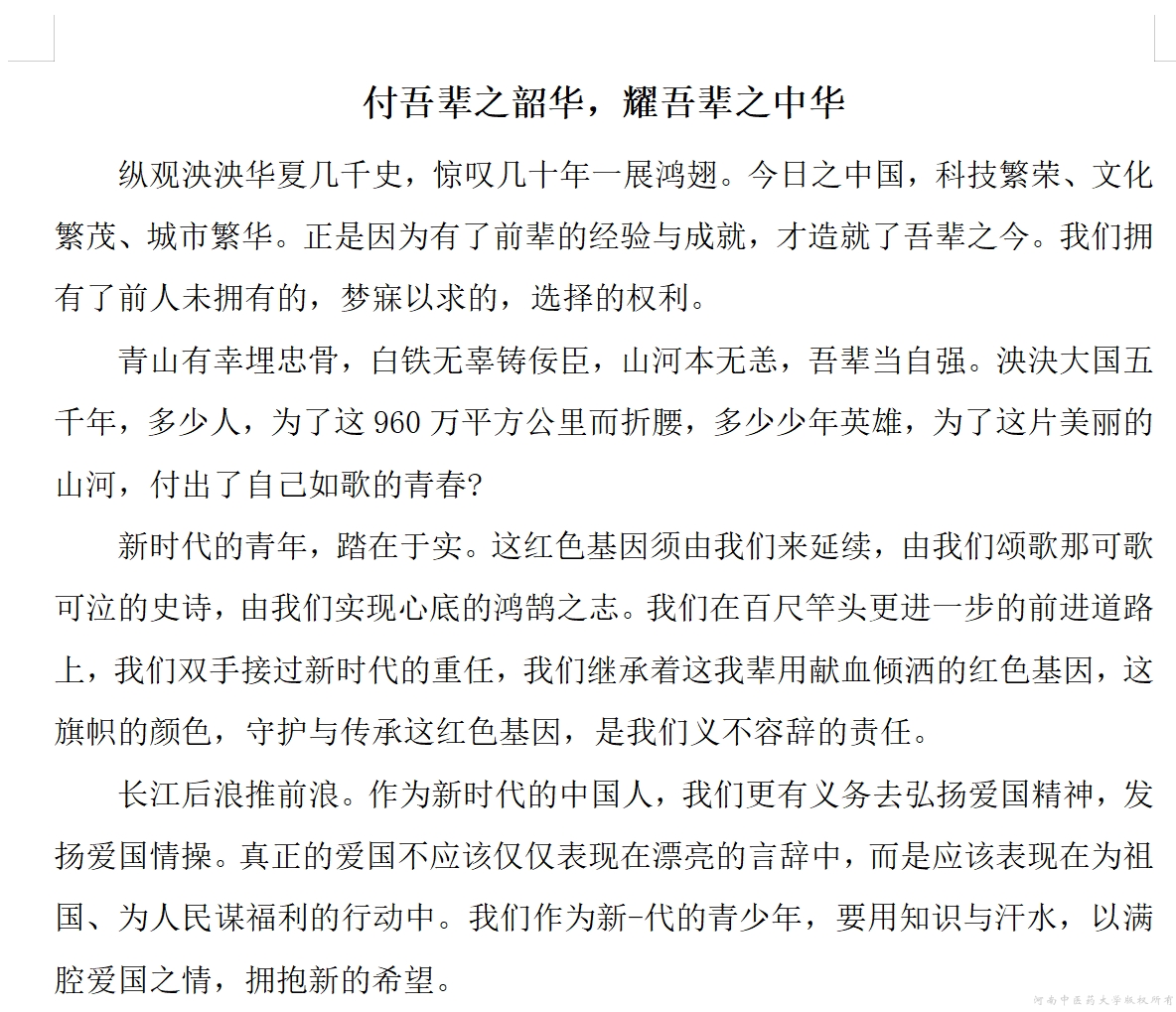 全体学生。经过前期宣传,活动受到同学们的积极相应与热情参与,创作出了许多优美而富有强烈爱国思想的文章,在作品中体现同学们的爱国情怀。其中,来自2021级中药学类一班的杨永炎同学用“本”和“草”诉说着不谋私利、坚守本心的精神和自强不息、坚韧不拔的精神,表达出对未来的无限期望;2021级中药学类五班梁美娜同学则是用诗歌表达了对祖国的无限敬爱之情,一句“爱你的路上,我从不孤独”更是揭露了无数人内心深处对祖国的深切热爱。