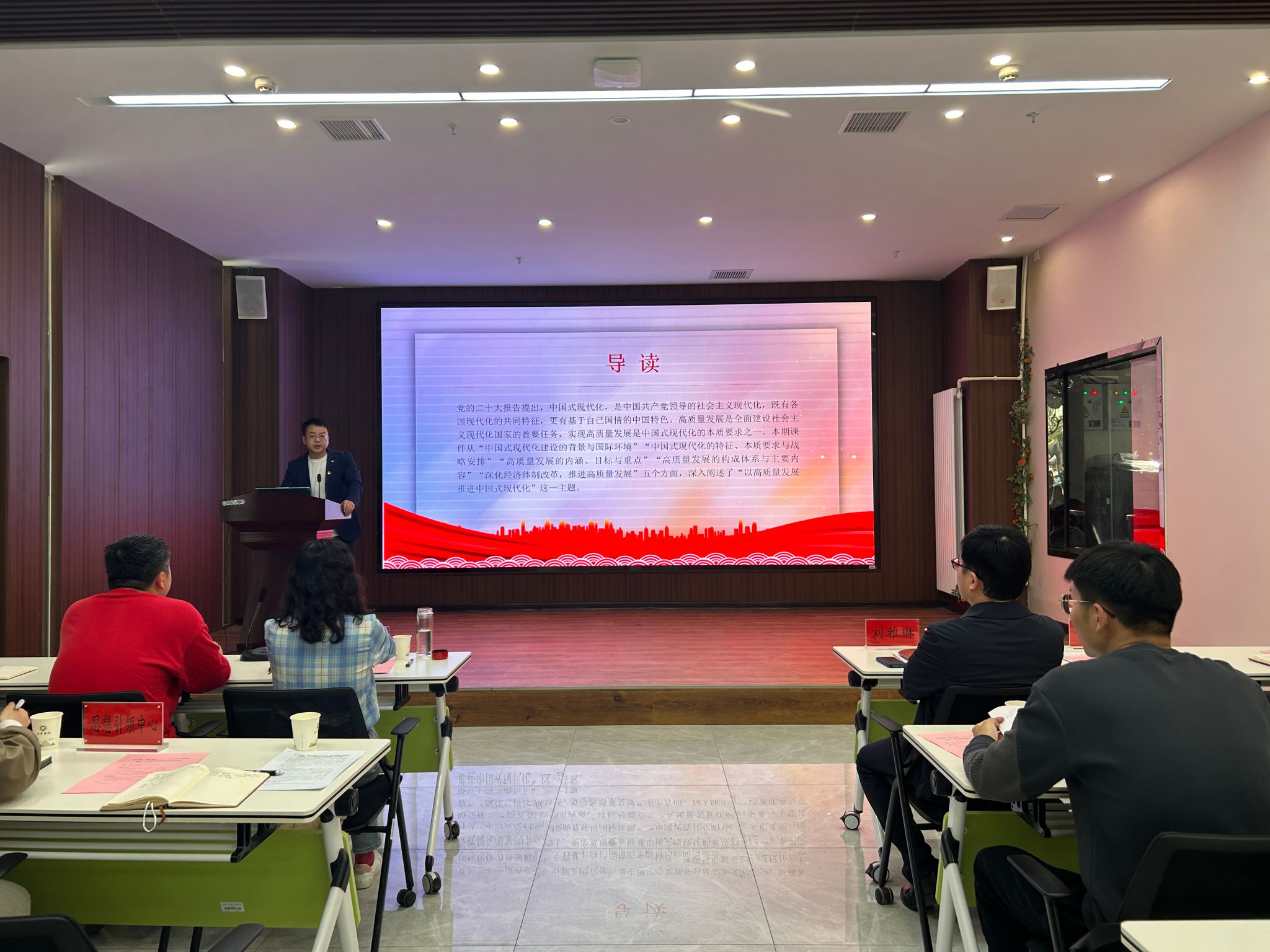 楚帅老师以《以高质量发展推进中国式现代化》为题带领书院师生共同学习党的二十大精神,楚老师从中国式现代化建设的背景与国际环境、中国式现代化的特征、本质要求与战略安排、高质量发展的内涵、目标与重点和高质量发展的构成体系与主要内容等四个方面向大家解读党的二十大精神,并结合经济数据、大国重器、中医药的发展等方面的知识引导同学们深刻认识以高质量发展为统领,做好创新驱动、收入分配、市场经济和绿色低碳等方面工作的重要性,深刻认识推进经济体制改革,必将为中国经济高质量发展、中国式现代化建设目标的圆满实现打下坚实基础。