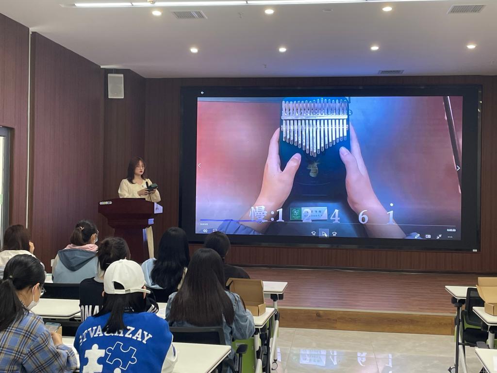 首先,朋辈导师陈莉萌对本次活动的情况进行了简要的介绍,让同学们对带教朋辈导师和所学乐器有了深入的了解。接着,朋辈导师张玥对卡林巴拇指琴的构造、弹奏方法以及简谱进行了细致的讲解,引起同学们对卡巴林学习兴趣。在观看认识简谱的视频之后,张玥带领同学们学习了音符的唱法和音阶的区分,在此基础上进一步学习了卡林巴基础弹奏指法“拨音”和进阶弹奏指法“哇音”“滑音”。现场气氛热烈,互动频繁,在场同学都跃跃欲试。经过学习,同学们可以熟练弹奏出流行乐曲《水星记》。最后,根据参与同学的学习情况进行了评比并颁发了奖品。