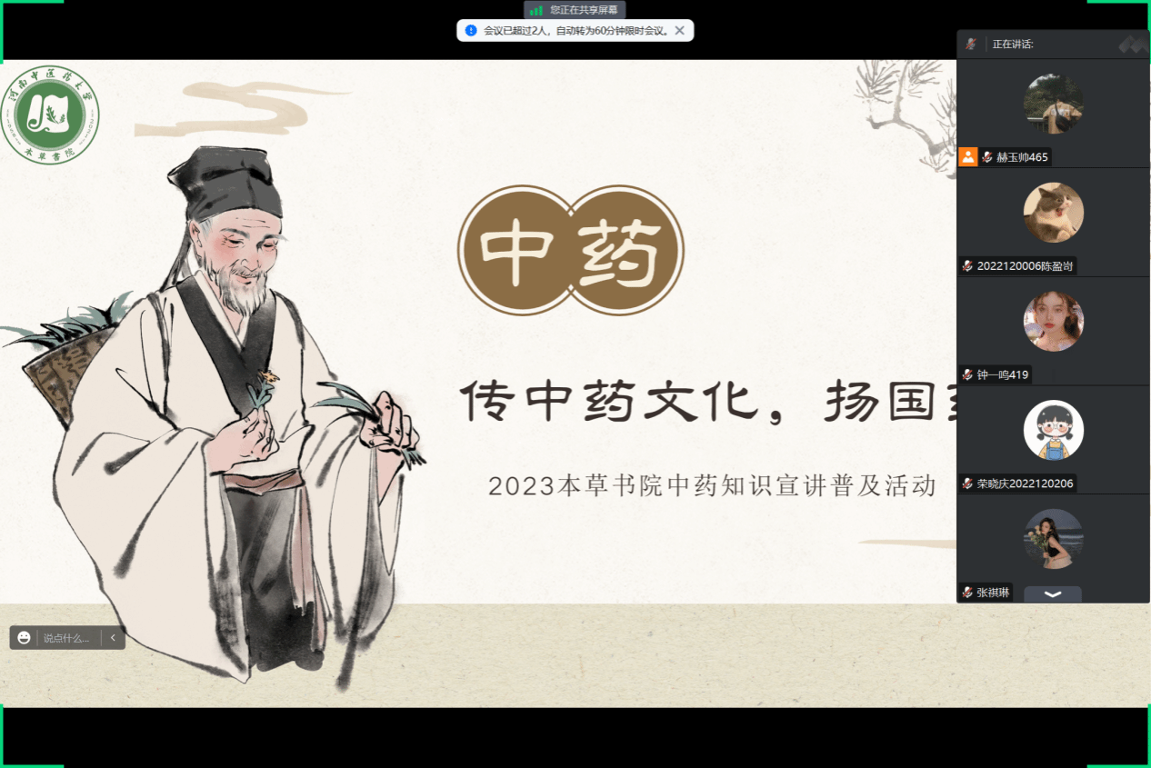 于2023年8月24日面向书院全体学生举办“传中药文化,扬国药精髓”线上中医药宣讲普及活动,共计66人参与到活动中。