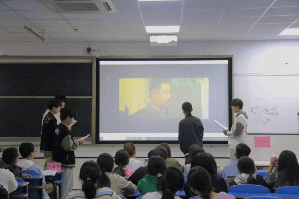 活动前期,同学们通过查阅历史资料了解红色视频的背景,并摘取电影片段进行作品剪辑、消音。在活动现场,同学们将情感深刻代入到电影片段中的人物并对其进行声情并茂的配音。一幅幅珍贵的历史画面,一个个生动的历史故事,一句句铿锵有力的历史呐喊,生动讲述了当时的社会风情和百态人生,似乎听到了革命前辈们穿越时空的宣言,再现了革命英雄为了国家和民族勇敢斗争的场景,表达了革命前辈为了祖国“站起来”的宏愿与不屈的决心。参与活动的同学们也纷纷表示忆往昔、创新纪,我们会自觉肩负起新时代的职责使命,传承红色文化,感悟红色精神,在建设伟大祖国的历史征程中传递青年力量。