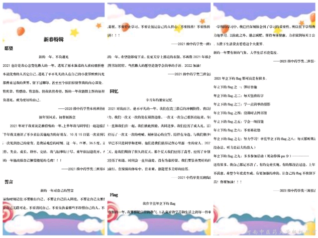 此次“旧年别风采,初春展新意”活动受到了大家热情响应。活动一经发布,同学们便通过QQ空间等形式积极宣传,大家积极参与,将自己辛丑年的目标及独家记忆分享出来,积极交流,感慨自己一年里面的所学、所感、所悟。其中,2021级中药学类五班陶思雨同学书写对自己高考奋斗史的感慨,“仿佛一朵姹紫嫣红的奋斗之花,孕育了三年,只为那一瞬间”,勉励自己在新的一年里踏上新的征程。2020级中药学类本科班孙静怡同学则书写下对自己的期待,“愿卓才华艺相为伍,好运机遇竟追逐”。大家积极将自己的思绪跃然于纸上,字句灼灼递新意,让本次活动收到了许多文笔优美的作品,获得了圆满成功。