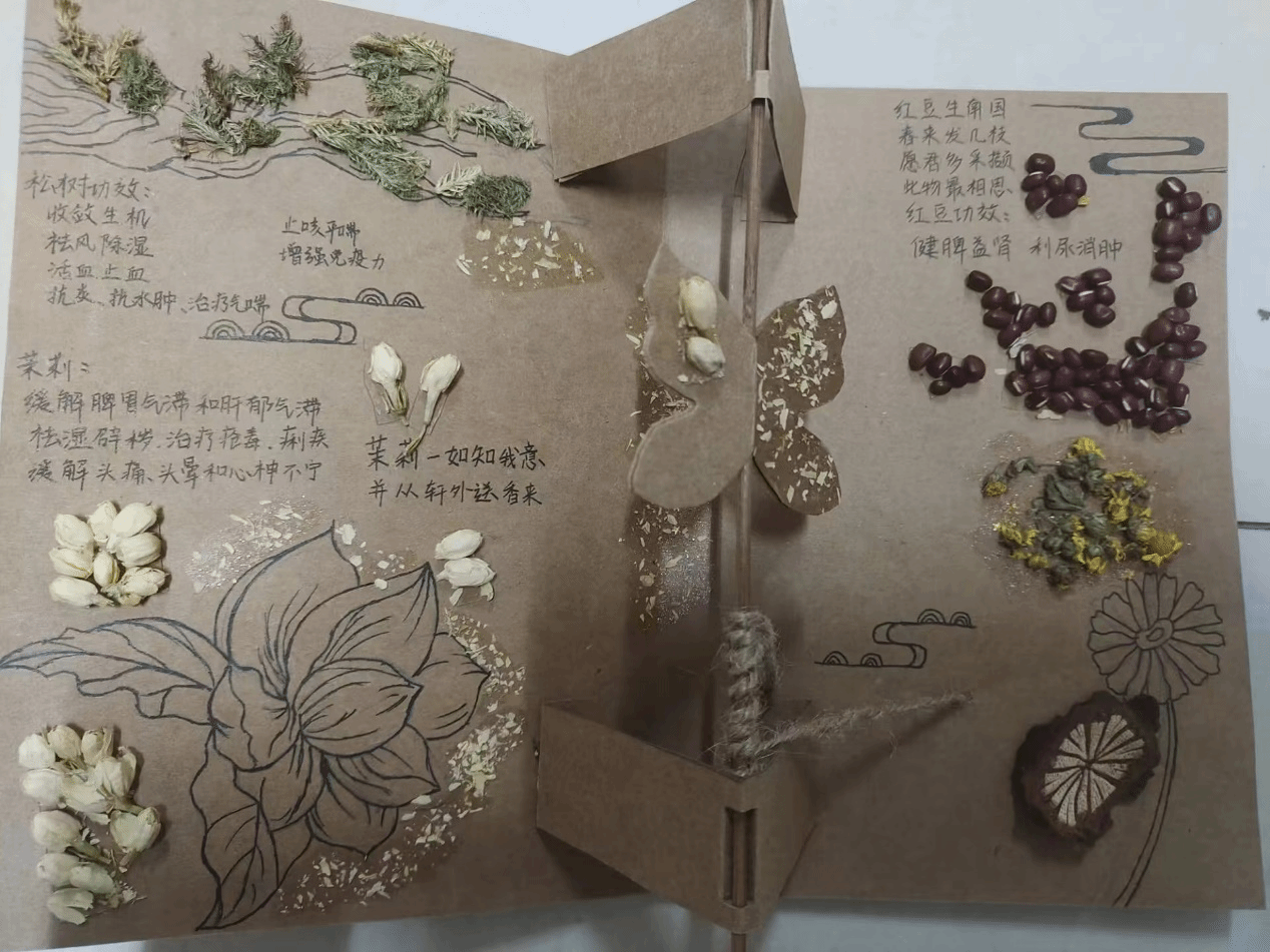 活动开始,由社团工作人员向同学们讲解基础翻页立体书的制作方法。讲解结束后,负责人为同学们提供多种中药,例如红豆、茉莉花等,同学们先对立体书进行内容设计,规划好中药材的颜色搭配,再进行中药粘贴制作。同时,教学人员会持续给予同学们不同的建议和指导。其中,2023级中医康复本科二班郭佳茵同学通过绘画和中药与文字解说,以清楚的文字解疑答惑,清晰的线条勾勒松树的坚韧和茉莉旺盛的生命力;2022级预防医学本科班苏比努尔同学的作品通过剪贴与中药粘贴,使作品恢宏大气,极具观赏感。