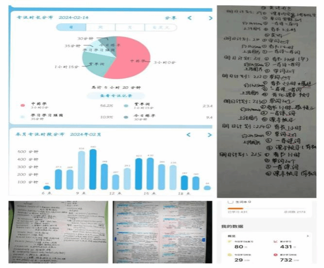 本次活动采取线上打卡的形式,参与活动的同学们需要在活动群中建立群相册,借助线上软件记录学习时长,每天在规定时间内提交今日学习情况、学习证明以及明日学习计划。活动过程中,同学们热情高涨,积极主动,努力完成当天学习任务,营造了良好的学习氛围。活动结束后由工作人员根据学习打卡持续天数、每日学习时长和学习质量进行评比。其中焦雅璟同学以14天不间断打卡记录、清晰明确的学习计划以及每天高效学习成果荣获一等奖,为大家树立了良好的学习榜样。