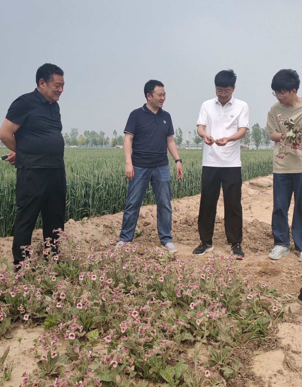 师生首站来到焦作市武陟县济华怀药种植专业合作社,在合作社负责人李克松陪同下参观四大怀药——怀山药、怀菊花、怀地黄和怀牛膝的种植田,了解怀药种植、管理和采收过程。期间,朱会宇、段懿哲与合作社负责人就“怀药生产过程同学生劳育工作开展有机结合”这一话题的深入交流与探讨,使道地药材的传统种植工艺为书院学子劳育创新开展赋能,帮助学生在第一课堂掌握专业知识的同时,走进怀药种植基地开启专业劳动教育的新模式。随后,调研师生前往沁怀四大怀药研究所,与研究所负责人李火金进行洽谈,对“怀药初加工与连作障碍与学生专业能力提升”这一话题进行洽谈,进一步通过专业劳动教育加深学生对专业知识加以巩固,并拓宽未来专业研究方向。