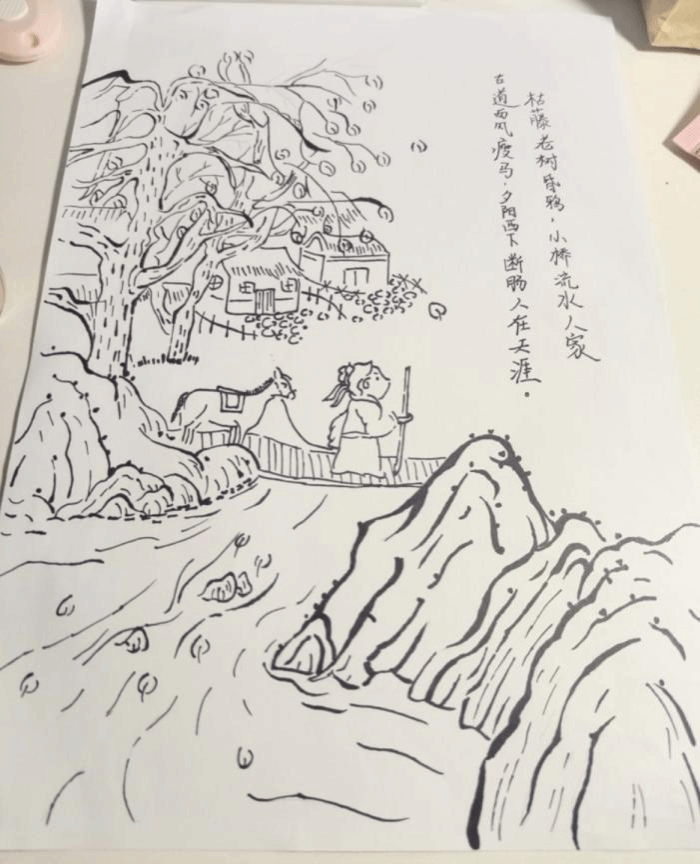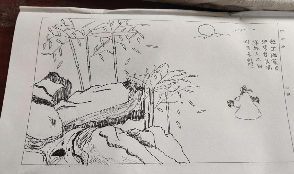 活动期间,参赛者们细细品味在历史上留下浓墨重彩的文人诗词,用画笔描绘出诗词的美妙,将自己的见解跃然纸上,借作品来弘扬中华优秀传统文化。其中,2021级药物制剂本科班叶锡梅同学的《天涯孤旅图》用生动的线条描绘出《天净沙秋思》中的凄美与苍凉,同时也传达一种坚韧不拔的生命精神,发人深省;2023级中药学类五班的李早艳同学的《竹里馆》大手一落,描绘出竹林深处有人家的清净安详画面。同学们用绘画的方式使古诗词中的意象具体化,笔画间满是对古人的崇敬和对中华传统文化的喜爱。