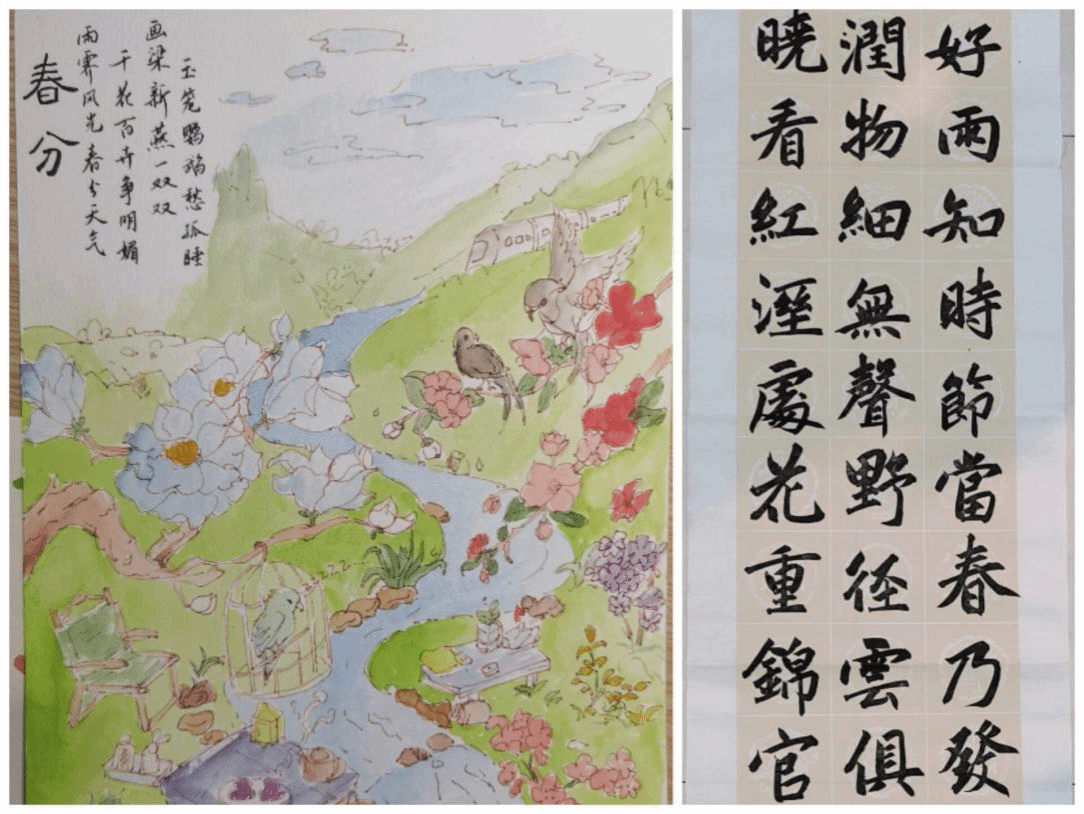 活动以节气为主题,加上新颖独特的形式,吸引了众多学子的积极响应。2022级中医学仲景二班方浩榕同学以《春夜喜雨》为题创作书法作品一幅,笔力遒劲,挥洒自如;2021级中医学本科二班仇春燕同学以《春分》为题作画一幅,作品色彩层次分明,构图巧思。