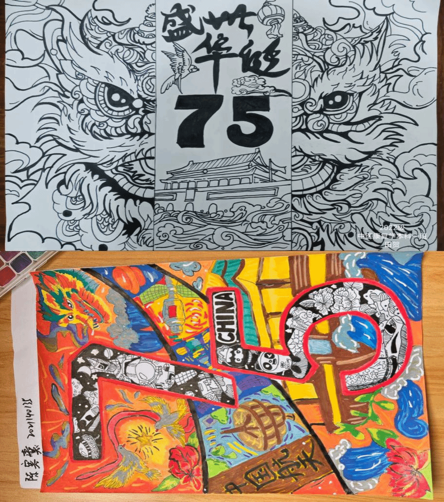学生对祖国的深沉情感,用创作诠释了心中的敬意与热爱。其中,2022级中医康复学本科一班的田贺同学,在作品中选用中国传统民间艺术——舞狮,2021级中医学本科四班陈寒囊同学的作品将航天元素融入数字75,同学们通过新颖的构图与精细的细节描绘,巧妙融合图案与主题内容,增强了作品的视觉冲击力与艺术美感,展现出独特的创意和深度。