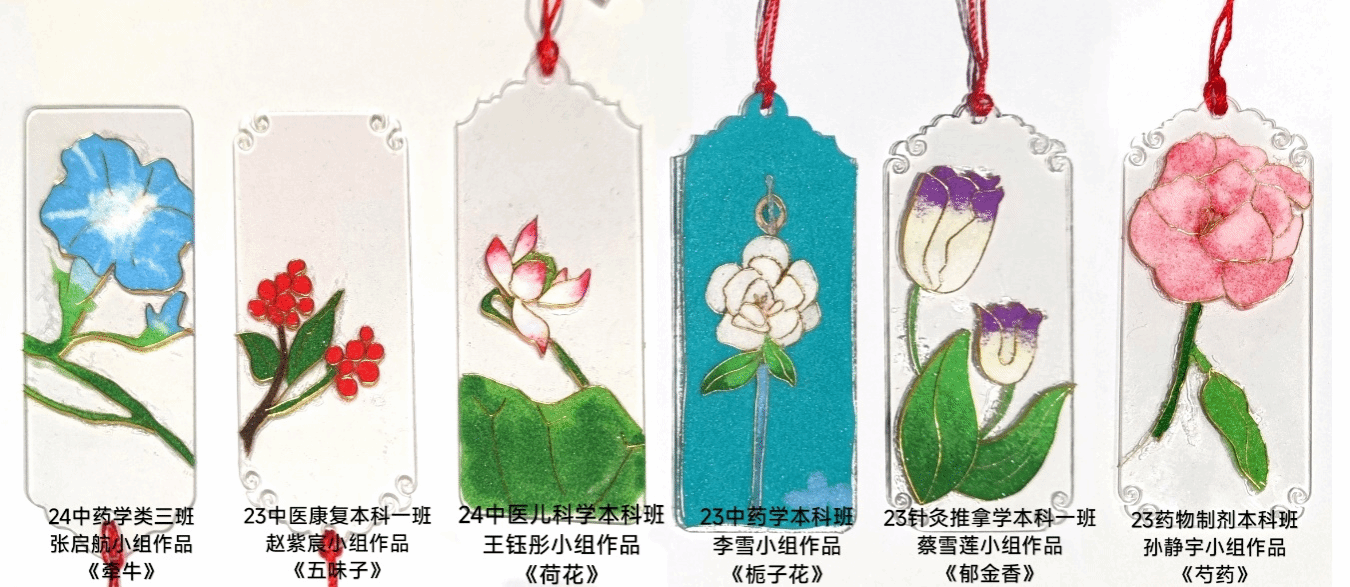 活动现场,同学们或三两组合,或独自行动,纷纷拿起工具开始了紧张有序的中药掐丝珐琅作品制作。他们细心地挑选金属丝,精心地勾勒线条,将中药元素融入作品中,展现出了自身的创造力。其中,23级药物制剂本科班的孙静宇同学组制作的芍药掐丝珐琅作品有着流畅优美的掐丝线条,如晚霞洒落般温婉柔魅的配色,宛若一场绚烂的梦境盛开在指尖。24中医儿科学本科班的王钰彤同学组制作的荷花整体布局宛如中医方剂,以中心的花为主药,以下方的叶为辅药,彼此相互配合,共同构成了一幅和谐的画面。经过紧张的创作,同学们的作品陆续完成。这些作品不仅色彩和谐、工艺精湛,并且创意独特,充分体现了中医药文化的传统韵味。