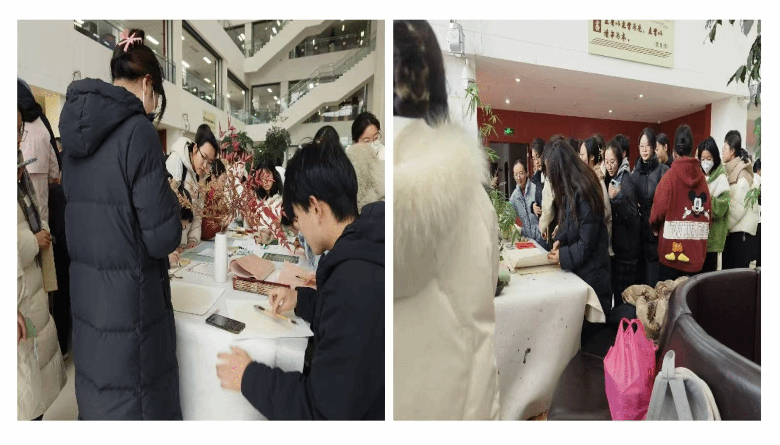 本次活动以弘扬传统文化为核心,巧妙地将文学之美与书法艺术相融合,让参与者在笔墨的流转中深化对中华优秀传统文化的认识与感悟。现场氛围热烈非凡,同学们满怀激情,依据个人兴趣与才情,尽情挥洒创意与灵感。有的挥毫泼墨,书写寓意吉祥的祝福语,如“平安喜乐”、“福满人间”,字里行间洋溢着对新年的美好憧憬与期盼;有的则沉醉于古诗的韵律之中,以笔传情,再现“长风破浪会有时,直挂云帆济沧海”的豪迈与“天生我材必有用,千金散尽还复来”的自信,仿佛穿越时空,与古代诗人心灵相通;还有的精心挑选经典美文,如“雨,像牛毛,像花针,像细丝,密密地斜织着”,以细腻的笔触勾勒出雨中世界的温婉与灵动,墨香四溢间,一幅幅生动的雨景跃然纸上;更有心灵手巧的同学,以画笔为媒,绘制出一幅幅娇艳花朵与灵动飞鸟的插画,斑斓色彩间,寄托着对美好生活的无限向往与追求。