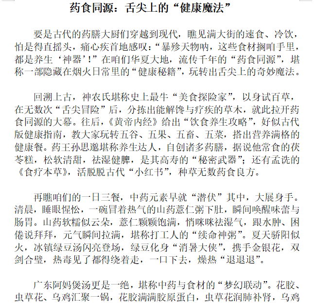 以笔为舟,以文为桥。同学们以药食同源为引,围绕中药养生的历史与现代生活,构建起一片交流的心灵港湾,大家齐聚一堂,分享个人在养生道路上的点滴感悟与独特心得。每一篇作品都触动着读者的心弦,引据经典的同时,又不乏趣味,引人入胜。其中,2023级中药学本科班杨深琪的作品更是让人眼前一亮,作者独辟蹊径,深入且精妙的阐述了药食同源的核心理念,从《黄帝内经》的智慧箴言到历代17k小说