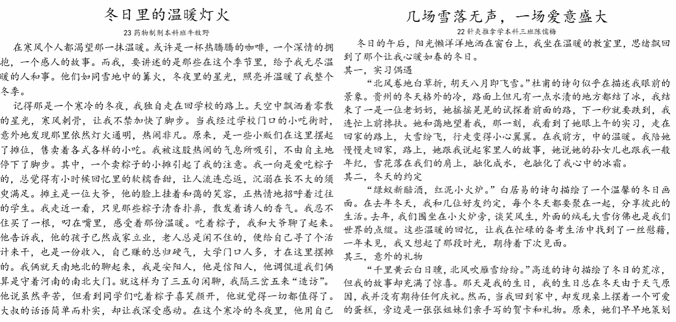 本次征文活动以冬日暖心故事为主题,吸引了众多同学踊跃投稿。活动期间,同学们或回忆冬日里与家人围炉夜话的温馨场景,又或讲述在冰天雪地中的奇遇,纷纷将自己的冬日故事付诸笔端,化作一篇篇暖心动人的文章。在众多的优秀作品中,22级针灸推拿学本科班陈儒梅同学的作品《几场雪落无声,一场爱意盛大》,她以细腻的笔触和真挚的情感,向我们展现了冬日里的温暖与爱意。作品以五段小故事串联全文,每一部分都充满了温情和感动。让我们感受到了冬日里的温暖与爱意,也为我们的校园生活增添了一份温馨与感动;而23药物制剂本科班牛牧野同学的《冬日里的温暖灯光》,则像一幅温馨细腻的冬日风情画以其细腻温婉的笔触,深情讲述了作者在大学冬日里偶遇的温情片段。那些看似微不足道的小事,在作者笔下却汇聚成一股股暖流,流淌在读者心间,不仅点亮了冬日的寒冷,更照亮了我们内心世界的每一个角落,温暖而感人。这些作品不仅展现了同学们扎实的文字功底,更表达了他们对冬日独特的感悟和理解,让读者从文字中领略到冬日别样的风情。