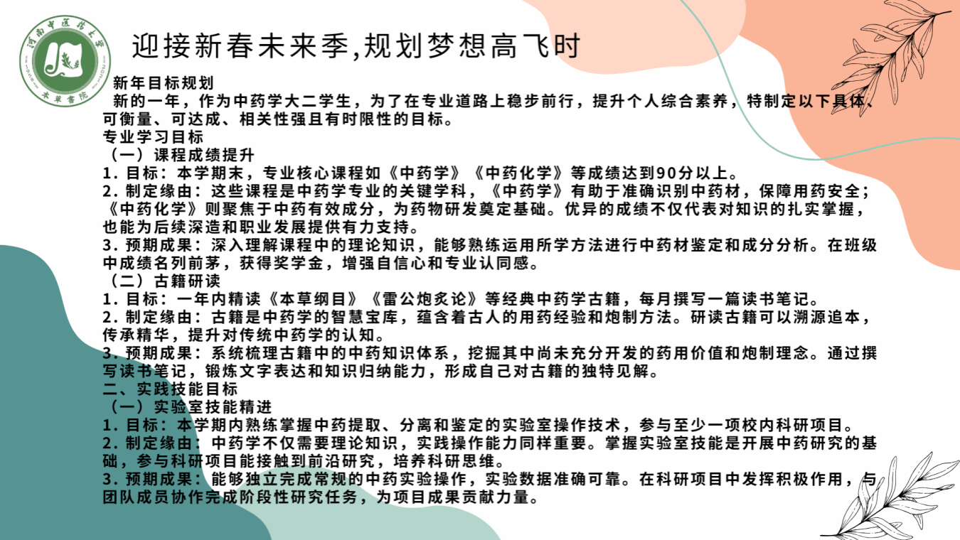 活动期间,参赛同学们热情高涨,精心制定并提交了个人的目标规划表。这些规划表不仅目标设定具体明确、具备可衡量性与可达成性,并且紧密相关、时限清晰,同时每个目标的制定缘由阐述详尽,预期成果展望明确。通过提交的目标规划表,同学们不仅彰显了对自己成长方向的深刻认知,更激发了内心不断前行的动力。其中,23级中药学班的石静茹同学凭借其详尽可行的目标规划荣获本次活动一等奖。她的规划表中,不仅包含了明确的制定缘由、切实可行的行动措施,还有清晰的预期成果,整体逻辑缜密,赢得了大家的一致好评。
