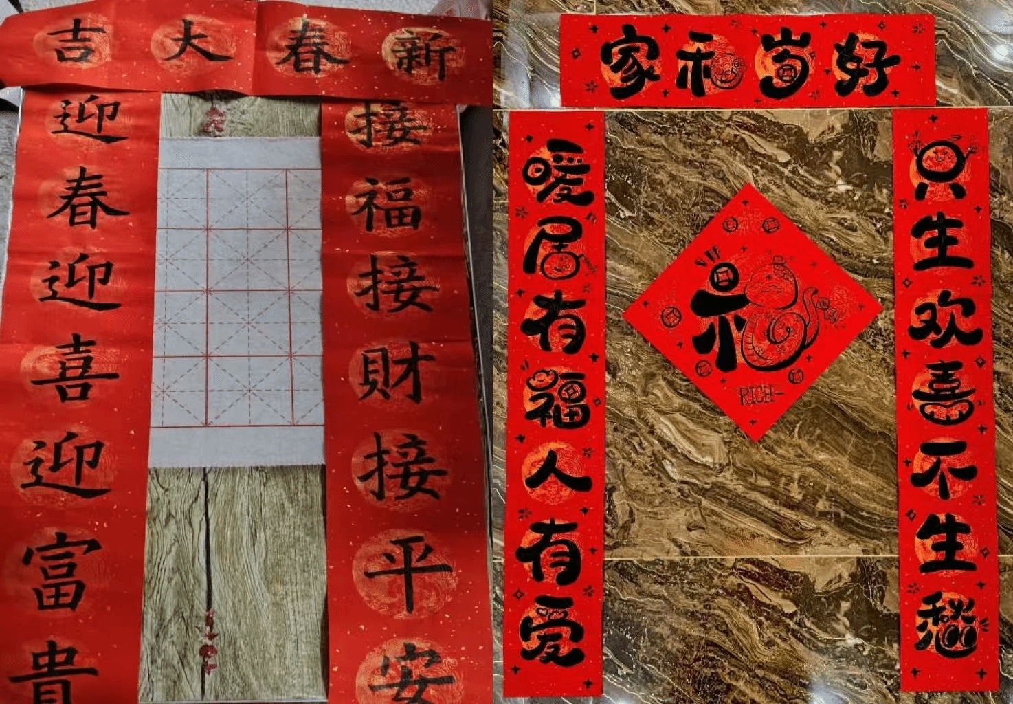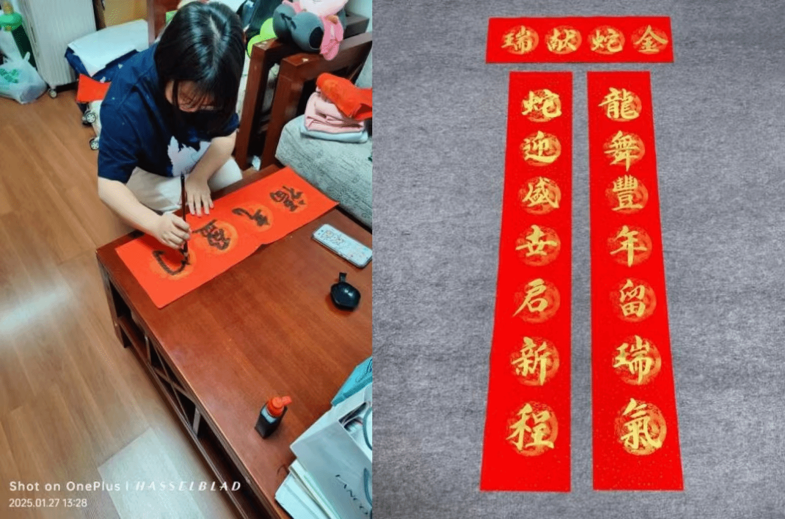 学予以笔墨为媒,以纸张为介,共同书写着对新春的期盼与祝福。其中,2024级中药学类二班李梦幻同学的对联,字体苍劲有力,气势磅礴,展现青春风采;2024级中药学类一班陈亚蕾同学的对联对仗工整,字里行间寄托着对来年的美好祝愿;2023级中药学本科班石静茹同学的对联用词精准,妙笔生花,以金色的笔触书写对生活与美的热爱和追求;2023级药学本科班赵天姿同学的对联则创意十足,字迹圆润可爱,将书画结合,为本次活动增添了别样的风采。他们的作品不仅展示了个人才华,更体现了对传统文化与艺术的热爱与传承。