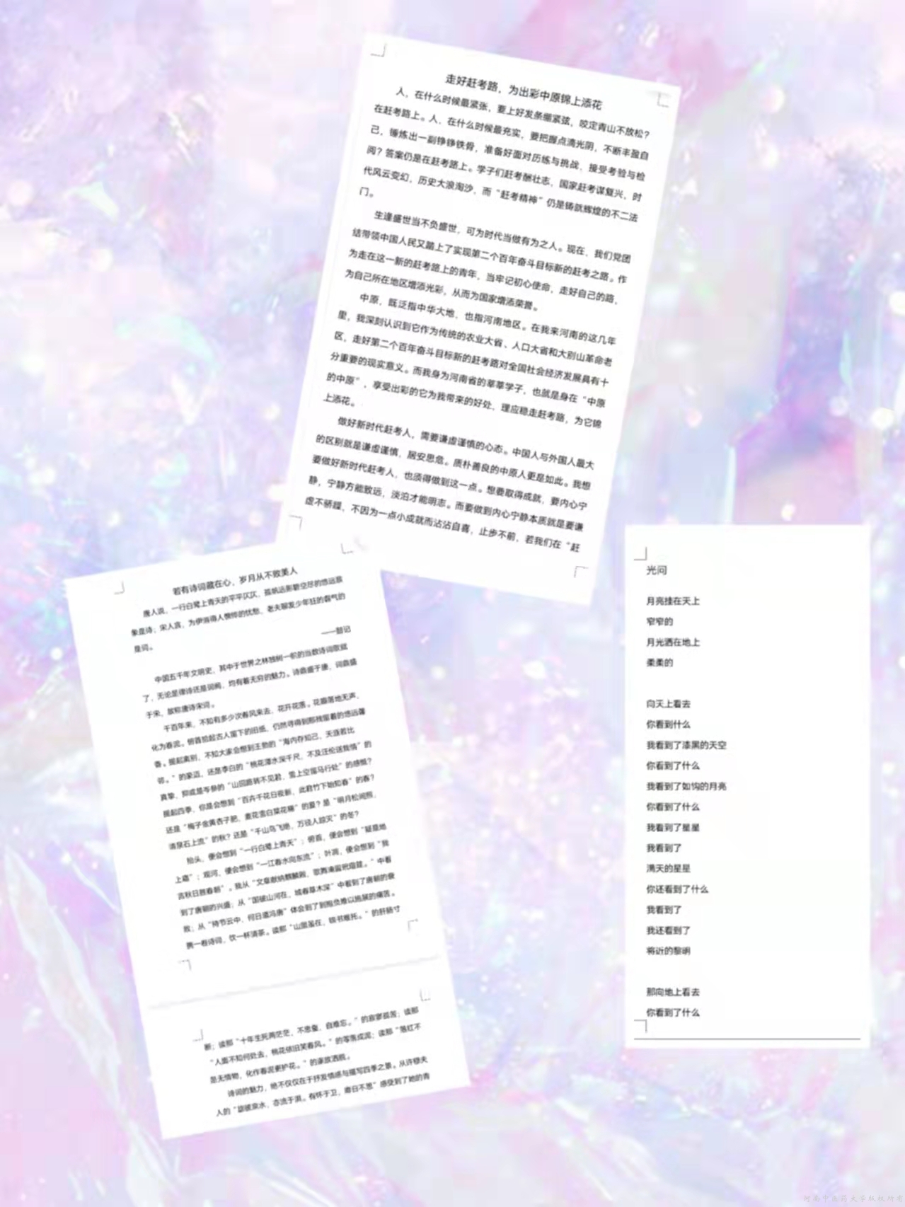 本次活动以“赶考路上有我”和“笔赞出彩中原”为创作题材,宣传党的精神文明内核为主要内容,追忆我党光辉足迹,展示中原风采,通过文字彰显青年人奋斗向上的精神。秦松枝同学的作品《光问》写出了当代青年仰望星空,脚踏实地的状态,同时表达了对美好未来的期待,对新中国繁荣昌盛、万里无疆的祝福,更有着对祖国温情永存的美好颂扬;临床医学专业的方心语同学作品《走好赶考路,为出彩中原锦上添花》中阐述了作为一名大学生所该有的优秀性格与思想,引导着我们思考新时代大学生如何更好的前行。大家纷纷表示,要以更加旺盛的斗志和时不我待的精神,在新时代的赶考路上书写更加优异的答卷。