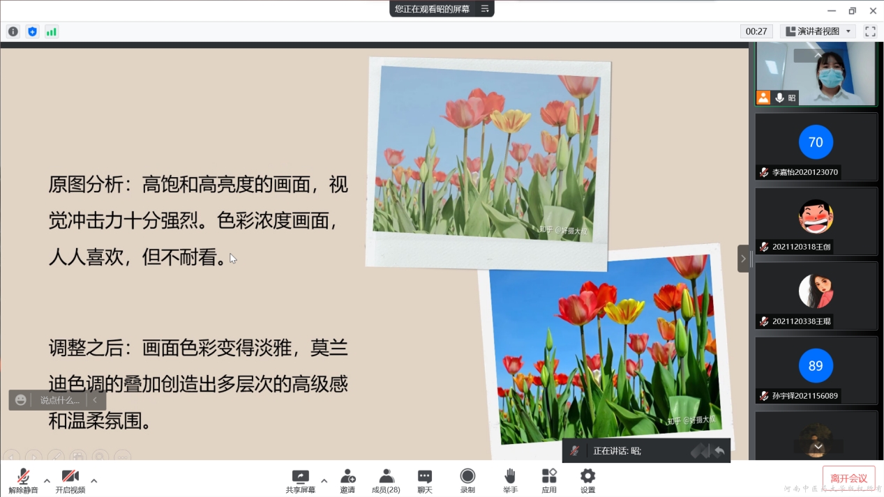 在本次活动由摄影协会成员高玉博和崔晓婷作为主讲人,分别从“鲜花滤镜”、“胶片感”与“光感”、“通透感”与“莫兰迪色”、“人像精修”、“脸部精修”与“细节处理”、“手机软件推荐”等方面展开讲解,崔晓婷推荐并介绍了几款处理图片后期的手机软件和电脑软件,同时分享了自己在修图方面的经验和小技巧,并结合实践,使学员在掌握实用摄影基础知识的基础上能够独立进行摄影创作和后期处理。高玉博引导同学们回顾和评价同学们曾经拍摄的照片,有针对性地指出了照片拍摄的不足,着重强调了改进方式。讲解内容生动有趣,赢得了同学们的高度认可。同学们在反思中收获了丰富的摄影知识,受益匪浅,并在培训结束后与其他社团会员积极讨论。