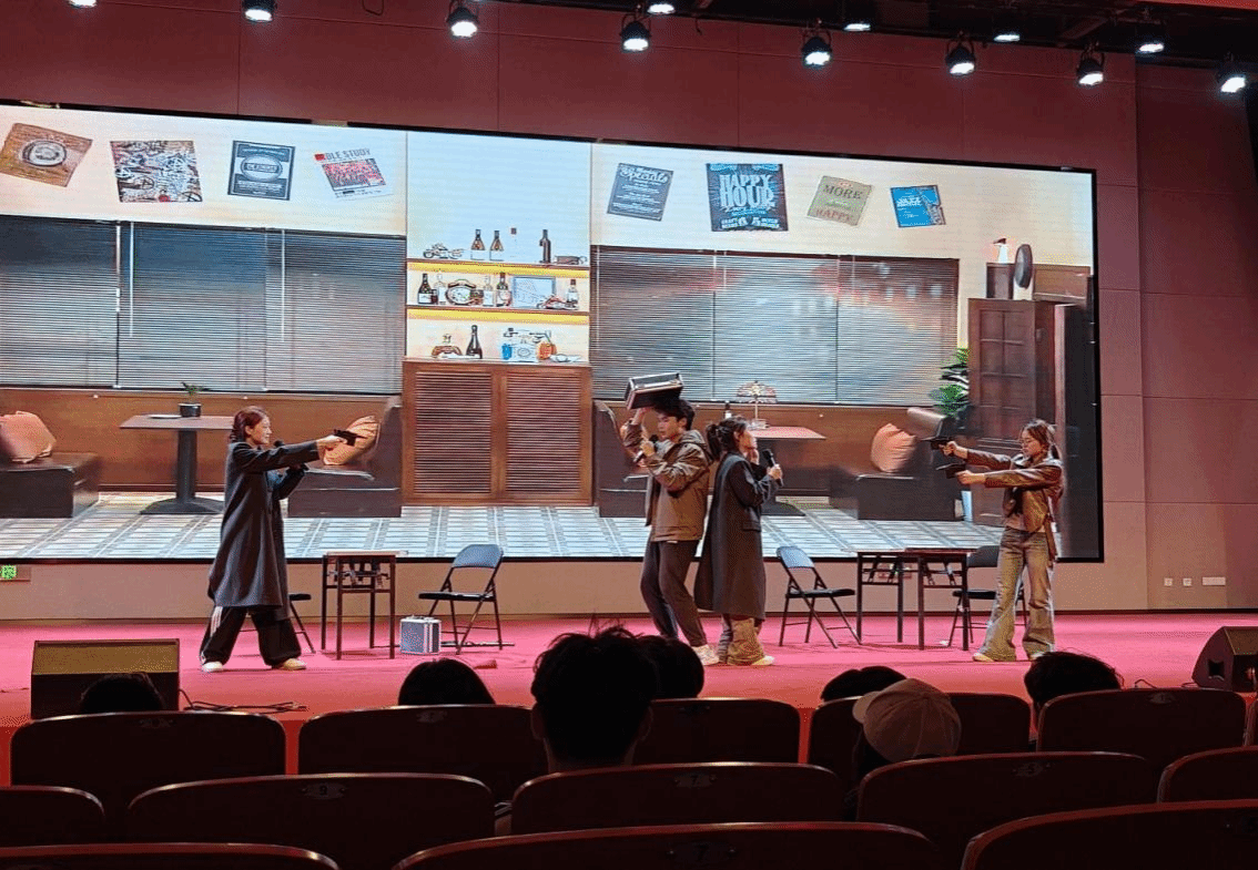 此次参赛的两部作品以独特的叙事视角引发观演热潮。《两杆大烟花》构建了充满戏剧张力的荒诞场景:身着同款黑风衣的烟花贩子与误售核弹的军火商在接头时频出笑料 —— 本想以烟花化解岳父矛盾的买家,在与军火商的错位对话中陷入窘境,而保洁阿姨意外发现核弹欲“发财”的彩蛋情节,更让剧情在讽刺与幽默中完成升华。《X 计划》则将镜头对准复杂人性博弈,小偷冒名 “汤姆” 混入酒吧接头帮派成员,舒克、贝塔等角色表面合作却暗藏 “黑吃黑” 算盘,26 个群聊场景的创意植入,巧妙映射当代年轻人的社交生态。剧中角色在试探、威胁与拉拢的交锋中推进剧情,最终以双关语收尾的悲剧性结局,让观众在笑声中陷入对人性的思考。凭借环环相扣的剧情设计与细腻的表演张力,《X 计划》最终斩获大赛三等奖。