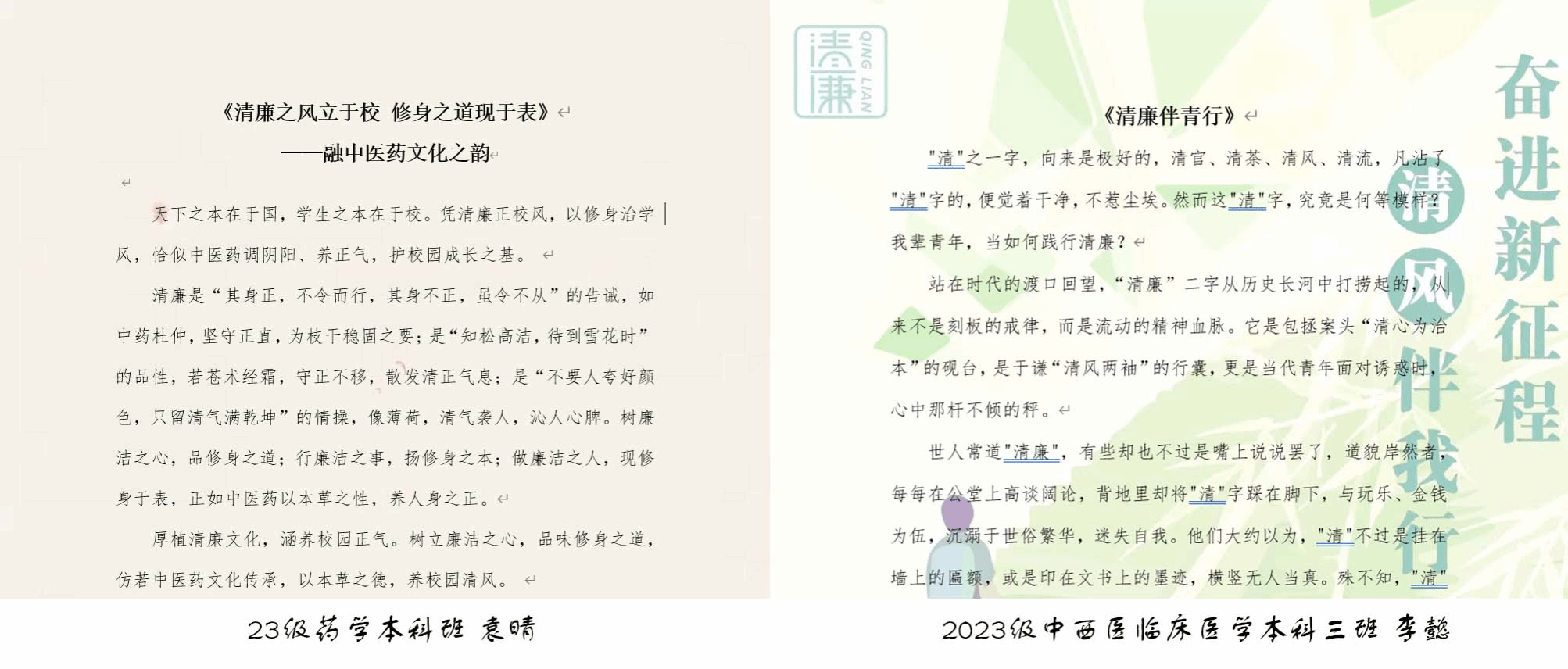 本次活动以“清廉”为主题,清廉之风与青春正气在文字中交相辉映,相辅相成。在中医药校园环境的影响下,一些作品如23级药学本科班袁晴同学巧妙地将中医药文化与清廉文化相结合,通过杜仲、苍术、薄荷、黄连、人参等中药的特性和功效,来比喻清廉与修身的不同方面。这种文化融合不仅展现了中医药文化的博大精深,也使得清廉与修身的抽象概念变得具体可感,易于理解和接受。是一篇富有哲理和文化底蕴的文章。它通过中医药文化的隐喻,深入探讨了清廉与修身在校园中的重要性,为当代大学生提供了宝贵的思想启迪和实践指导。文章主题鲜明、立意深远、文化融合、论证有力、语言优美、意境深远,具有很高的艺术价值和思想价值。23级中西医临床医学本科三班李懿同学文章结构清晰,先提出主题,再通过历史与现实的事例进行论证,最后回归到青年应如何践行清廉精神上。逻辑严密,各部分之间衔接自然,层层递进,使读者能够清晰地理解作者的观点和意图。关注青年群体,指出青年在面对物欲横流和浮躁难安的社会环境时,应如何坚守清廉精神。24级应用心理学本科班焦新然同学选用散文的题材来书写自己对清廉与青春的看法,充满诗意与哲理,以细腻的笔触描绘了返乡山乡的所见所感,将自然之美与人生哲理巧妙融合,展现了深刻的思考与感悟,以“山色澄”为题,不仅描绘了山乡的清澈美景,更寓意着人心的澄明与纯粹。作者通过山乡的自然景象,引发对青春、生命、廉洁等主题的深刻思考,传达出一种返璞归真、坚守初心的价值观,也引导读者思考如何在纷繁复杂的世界中保持内心的澄明与坚定。