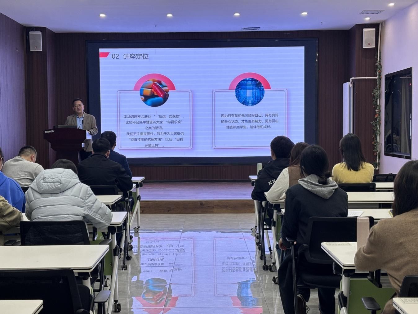 讲座以“高校教师压力管理与自我关怀”为核心展开。邱官钦结合高校教师日常工作场景,首先通过专业的抗压能力测试,让在场教师直观掌握自身压力水平,明确当前心理状态的优势与不足。随后,针对焦虑情绪调节需求,现场带领大家实操练习“3分钟呼吸法”,通过“深吸气4秒、屏息2秒、慢呼气6秒”的节奏控制,帮助老师们快速平复紧张情绪;分享“工作任务拆解、定期心理复盘”等实用技巧,指导大家将繁杂事务有序梳理、及时复盘心理状态,切实解决工作中任务堆积焦虑、心理压力难疏导等问题。同时,指导老师们做好学生日常监测、疏导等工作。整场讲座聚焦实战、拒绝空泛说教,内容贴合高校教师工作实际,提升其心理育人素养、精准回应学生心理诉求。