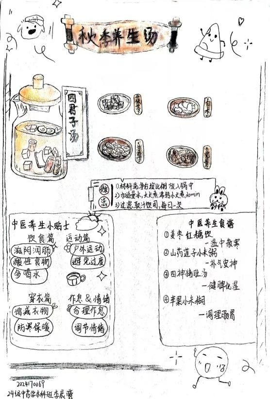 从立秋的“润燥为先食甘润”,到处暑的“温食忌寒护脾胃”,再到霜降的“温补避寒防燥邪”,同学们的手账不仅串联起整个秋季的养生要点,更展现了传统养生智慧与现代生活方式的巧妙融合。不少作品还创新性地加入了个人养生实践感悟,比如“坚持晨起喝温水后,秋燥口干症状明显缓解”“按揉极泉穴一周,肩颈酸痛减轻不少”,让养生知识不再是书本上的文字,而是可感、可行、可分享的生活体验。