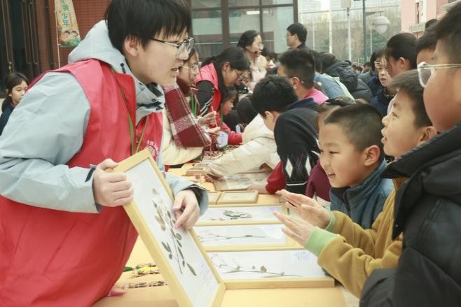 本次活动以“中药标本鉴赏、中药饮片辨识、中药手工艺品、中药茶饮药膳、中药知识互动”五大特色展区为载体,通过沉浸式体验与互动问答的形式,让同学们在趣味中解锁中医药知识,进一步深化了中医药文化在校园的传播效果。中药标本鉴赏展区中,志愿者向同学们展示了灰灰草、酸模叶蓼、野大豆等六种腊叶标本,以及书签、耳环、钥匙扣等款式的滴胶标本,生动讲解中药从植株到标本的转化工艺,引导同学们直观感受中药的形态与保存方式;中药饮片辨识展区则重点介绍了四大怀药、八大宛药的功效,还针对山楂、金桔等同学们感兴趣的中药开展互动问答与有奖竞猜,现场气氛活跃;中药手工艺品展区分为两个桌位,一边讲解掐丝珐琅、琉璃发簪的制作工艺,让学生亲手触摸、细致观察,了解中药花卉的药用价值,另一边则通过中药拼贴画和药皂制作教学,让同学们在创作中认识中药功效与用药禁忌;中药茶饮药膳展区则展示了黄芪党参八珍糕、益生元山楂茯苓饼、核桃桑葚黑芝麻丸等三款食疗糕点,志愿者讲解其功效与食用禁忌,同时介绍玫瑰金桔茶、蒲公英茶等茶饮的搭配与作用,通过“讲解-问答-品尝”的模式,让同学们在体验中学习健康知识;中药知识活动展区通过字谜竞猜普及枸杞、黄连等中药材知识,志愿者还为积极参与互动的同学准备了不同颜色、款式多样的香囊作为礼品,充分调动了孩子们的参与积极性。