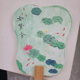 之美跃然扇面。2023级护理学保健英语本科班王姿懿同学的作品以清新笔触绘就荷塘清趣,红鲤游弋,搭配“如梦令”三字,将夏日池景的灵动与宋词意境晕染于扇面之上。参与同学纷纷表示本次活动趣味十足、收获颇丰。