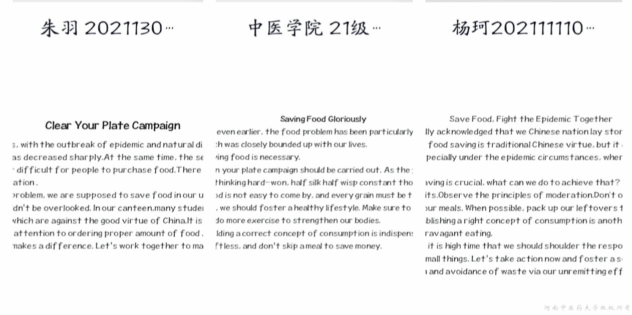 参赛选手围绕“勤俭节约”的主题认真构思,提交了多篇优秀英文作文。其中,2021级中西医临床医学本科二班的杨珂提出大家应该养成良好的饮食习惯,饮食遵循适度原则,减少浪费;2021级中医学仲景一班的王雯欣则通过引用谚语“一粥一饭当思来之不易,半丝半缕恒念物力维艰”来表现粮食的来之不易,呼吁大家应当珍视现在的美好生活,坚持勤俭节约的美德;2021级针灸推拿学本科三班的朱羽表示,近年来病疫和自然灾害爆发,作物产量急剧下降,世界上许多地区面临粮食产量不足的问题。当代大学生作为新时代青年,应身先士卒,杜绝浪费粮食,剩菜剩饭的不良现象,切实履行绿色生态文明建设。