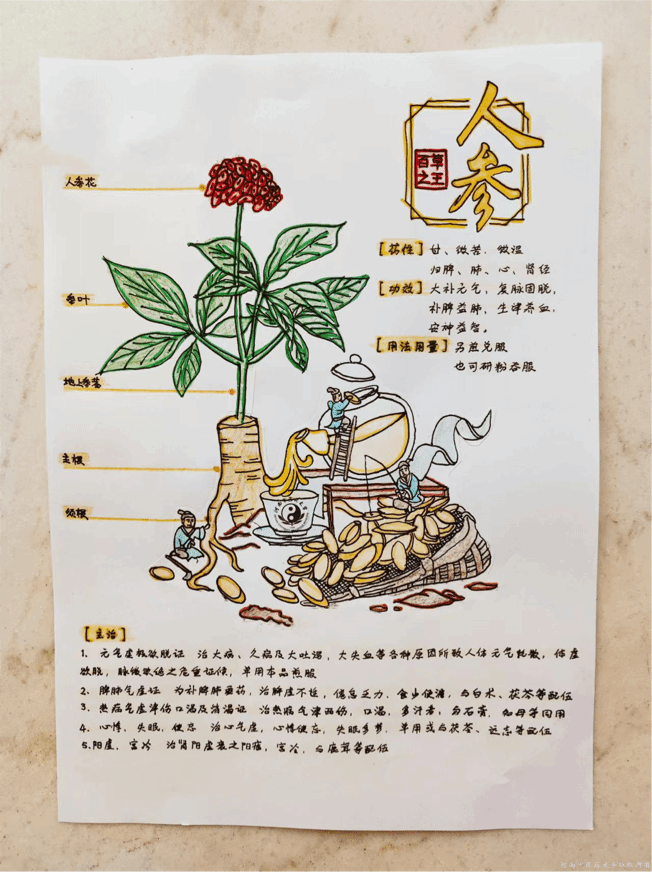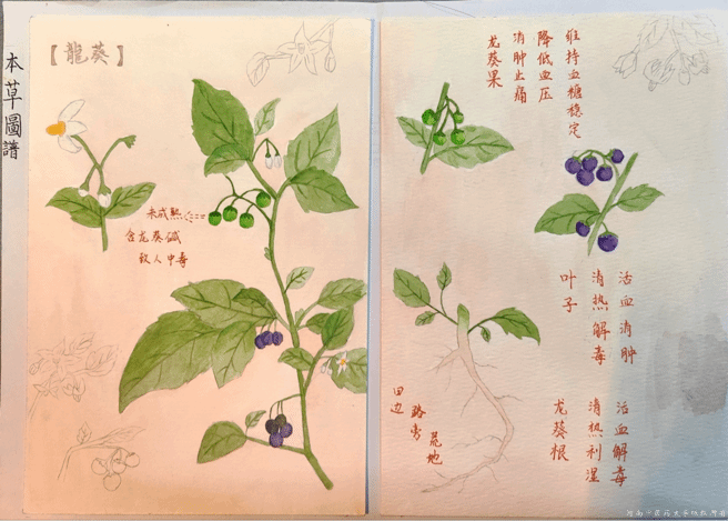 本次活动要求同学以中医药文化知识为基础,将手工创作与药植图鉴相结合,自由发挥制作创意药植图鉴。活动一经发出,同学们积极参与,通过翻阅资料,并结合所学专业药植知识,以绘画、黏土制作等形式展现属于自己的创意药植图鉴。在线上讨论群中,同学们激烈讨论有关的中药的知识,制作材料以及创意药植图鉴制作方法等内容,奇思妙想碰撞出不一样的火花。活动收集的作品创意出彩,布局巧妙,内容丰富,无不透露着同学们的博学多才和心灵手巧。如2022级护理学院护理学侯泓林的作品《人参》,介绍了人参的药性、功效、用法用量以及主治等内容,并巧妙结合药材使用场景,为画面平添一份趣味与生机,图中人参部分惟妙惟肖,色彩协调给人视觉上的享受。2022级医学院预防医学本科班叶艳琼的作品《龙葵的17k小说 图谱书样》描绘了龙葵不同时期、不同部位的局部特点,将龙葵的花、果实、根等部位通过水彩画的艺术形式同时展现出来,细节丰富,颜色写实,栩栩如生。