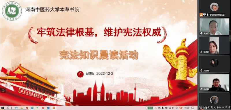 本次活动通过线上会议、主题团日活动等形式将集中学习和自主学习相结合,各班组织学生利用腾讯会议等平台观看直播并进行宪法内容晨读。同学们认真观看宪法学习视频,齐声朗读宪法内容,积极学习宪法知识,并在评论区讨论宪法内容,分享学习感受。2022级中药学类三班夏堉鑫同学表示,本次活动让自己深刻意识到宪法对我们的重要性,巩固学习了宪法知识,加深对宪法的了解。2022级中药学类三班梁亚恩同学表示,本次活动增强了自己的法律意识,今后会进一步了解法律、相信法律、遵守法律,学会运用法律维护自身的合法权益。