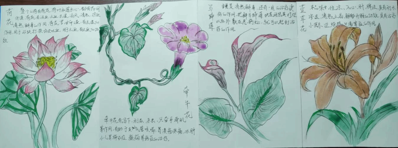 中国》脱颖而出,令人赞叹不已,向同学们生动地展示了荷花、牵牛花、马蹄莲和萱草花的脉络及风貌,再配以清晰文字解说,让同学们了解到这四种中草药习性和功效。