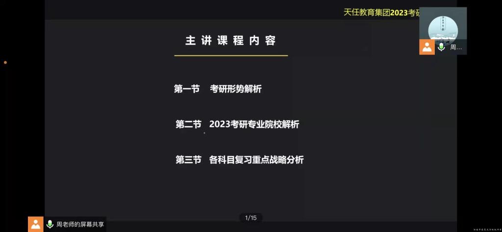 于2022年4月15日邀请天任教育周恒老师为2023届毕业生进行线上考研辅导,双创孵化中心主任高巍老师担任主持人。