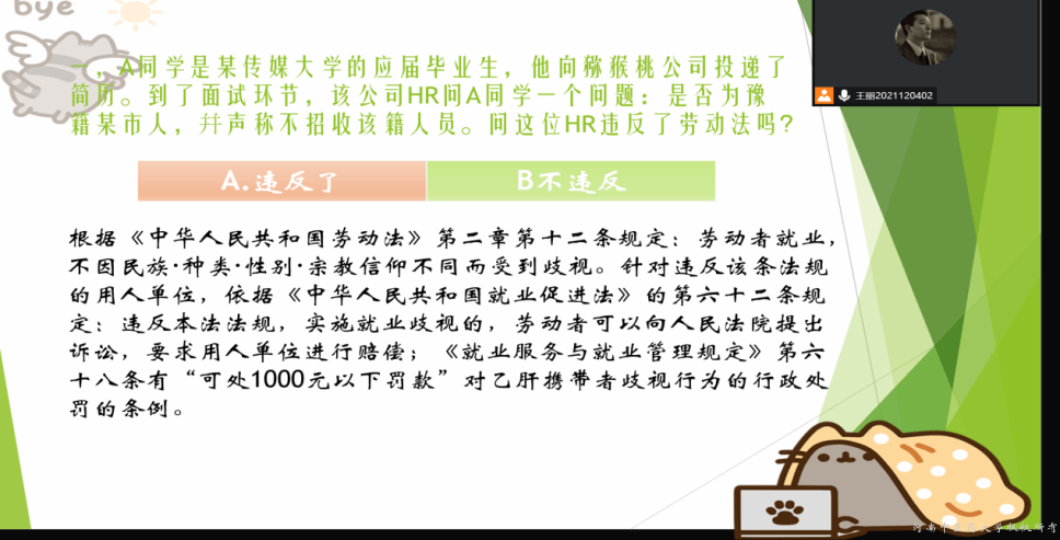 活动中,主持人首先带领大家了解了劳动法的应用场景,讲述了劳动法对当代大学生权益的保护,让学生们对劳动法知识有了初步的认识和了解。接下来,主持人宣读比赛规则,提出案例请选手结合刚才所学知识和自身理解竞答,回答完毕公布答案并对案例进行分析,剖析其背后的法律知识。最终,评选出一等奖1名,二等奖2名,三等奖3名,优秀奖4名。活动结束后,同学们均表示受益匪浅。一等奖获得者2021级中药学本科班江飒飒同学说,此次活动拓展了自己的知识面,提升了职业素养,对于将来职业生涯的发展具有促进作用。