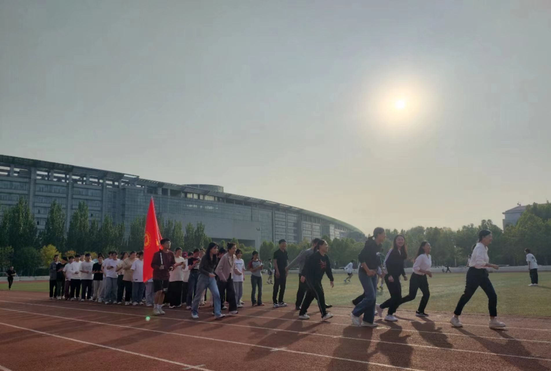 学生在导师们的带领下,迎着阳光从起跑点出发,以青春之姿踏上奔跑征程。终点亦是起点,奋斗永远在路上。