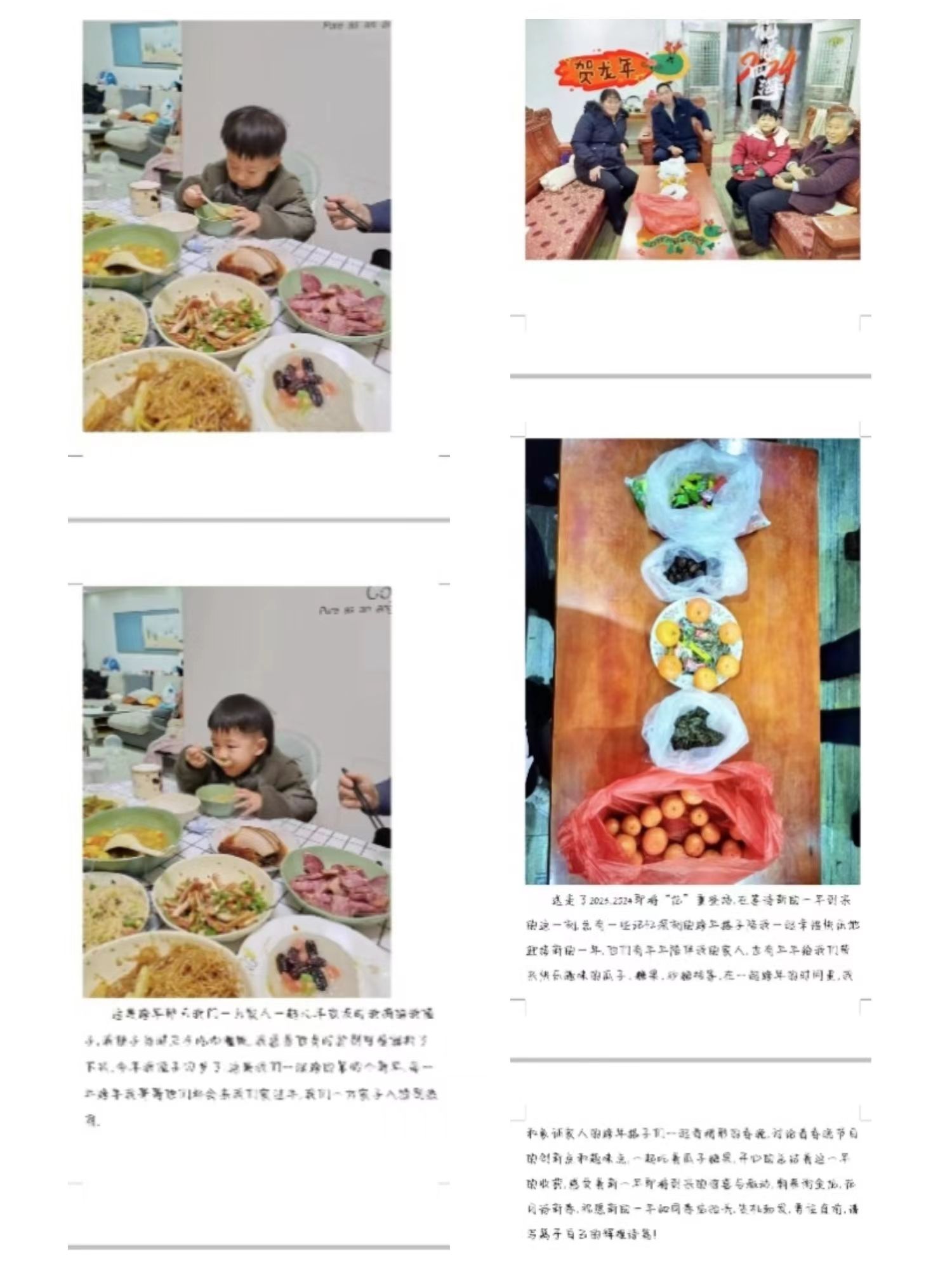 本次活动以线上提交作品的形式开展,共收到作品30余份。参加活动的同学通过照片等形式记录了和跨年搭子一起过春节的场景,并用文字抒发内心感悟。2023级中药学类二班张雨欣同学和家人吃年夜饭,并和侄子温馨互动,节日氛围浓厚;2021级中药学本科班江飒飒同学和家人一起聊天看春晚,画面有爱。一张张照片记录了同学们与亲友团聚的美好瞬间,分享了春节期间的幸福喜悦,使大家感受到了浓浓的春节氛围和传统文化气息。