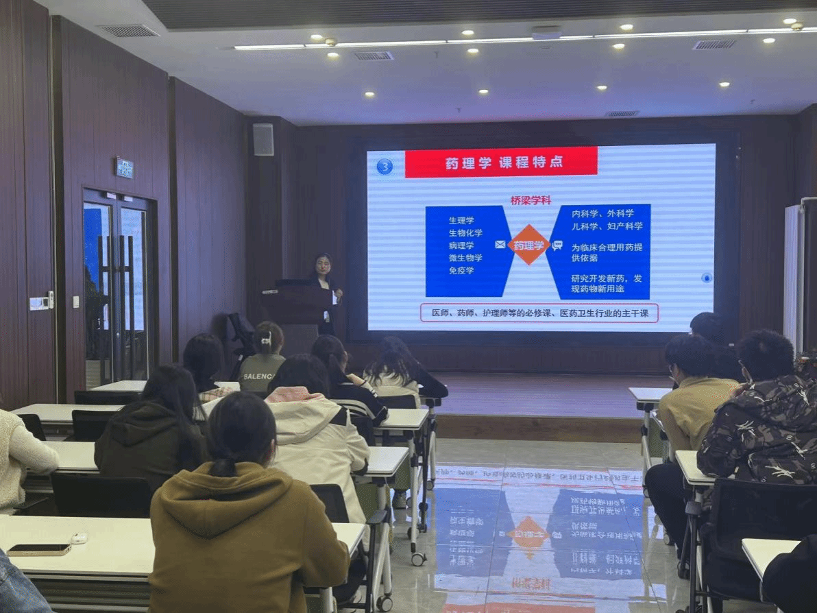刘亚敏从学业规划的角度出发,将讲座内容细化为身心健康,努力学习,德才兼备,报效祖国四大核心主题。她关注同学们的身心健康,希望大学生作息规律,维持良好的人际关系,做开朗的健康青年。就学业方面,她指出大学生应当制定长远的目标,将个人未来规划与国家的发展相结合,从多角度去思考和分析问题,要善于学习和归纳以促进个人发展。就专业规划方面,刘亚敏指导同学们要遵循个人兴趣,着眼长远,走出“易过关”和“学分至上”的选课思维,以发展为导向去选择专业和课程。为方便同学们理解,刘亚敏以药理学课程为例,讲述了有规划、系统性学习专业课程的重要意义。讲座的最后,刘亚敏就同学们提出的困惑做出了解答和指导,现场氛围良好,同学们倾听认真,师生互动丰富,情感真挚。