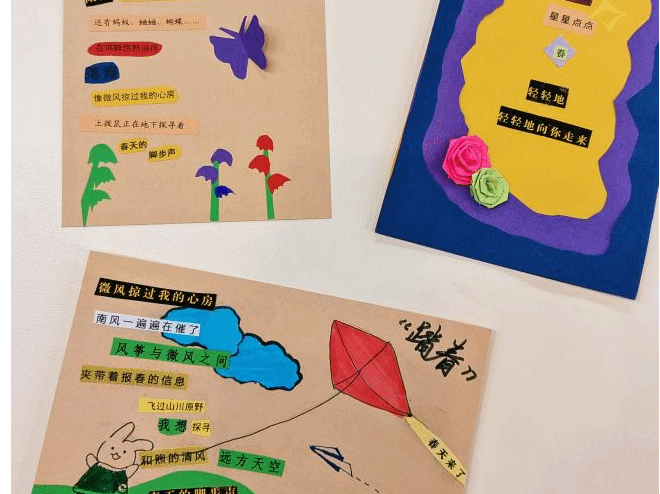 本次活动以“把春天拼成诗”为主题,要求参赛选手充分发挥想象力,将对春天风物景致的所思所感通过诗词拼贴创作的形式展开。面对一张一张棕色留白的卡片,同学们充分发挥想象力与创作力,将所感所悟淋漓尽致的展现到卡片创作上,不同小组有着自己不同的创意,制作出一份份优秀的作品。在优秀作品上可以看到,不同颜色的纸张交错粘贴于原本的卡片之上,花朵树木勾勒其中,蝴蝶在纸张上栩栩如生,好似翩翩起舞。文字拼接出“春阳划破严寒,不觉已是芳菲三月天”,展现诗情画意。在卡片制作的过程中,同学们聚精会神、全神贯注的投入到创作中,用拼贴诗词和景色来捕捉春天的美好瞬间,感受诗意在手中流淌。