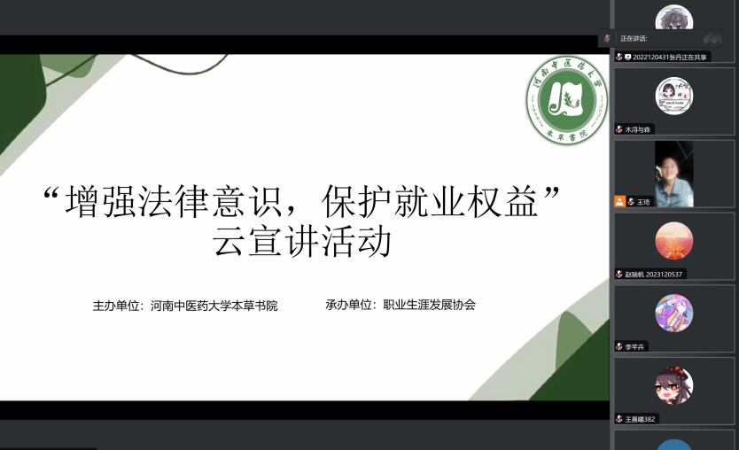 于2024年4月14日线上举办“增强法律意识,防范就业风险”云宣讲活动,职业生涯发展协会承办。
