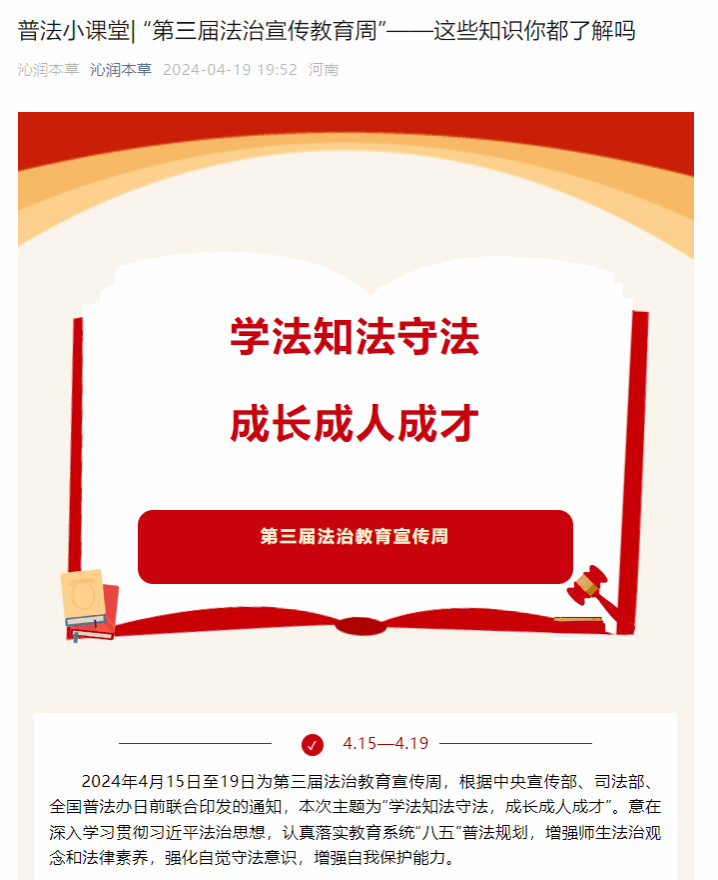 本网讯(文/周雨薇 姚湘 图/彭俊茹 郑玉洁)春风拂面,万物复苏,法治之花绽放校园。为了深入学习贯彻习近平法治思想,认真落实我校“八五”普法规划,进一步推进依法治教、依法治校和依法办学,营造浓厚的法治教育氛围,2024年4月15日-19日,17k小说