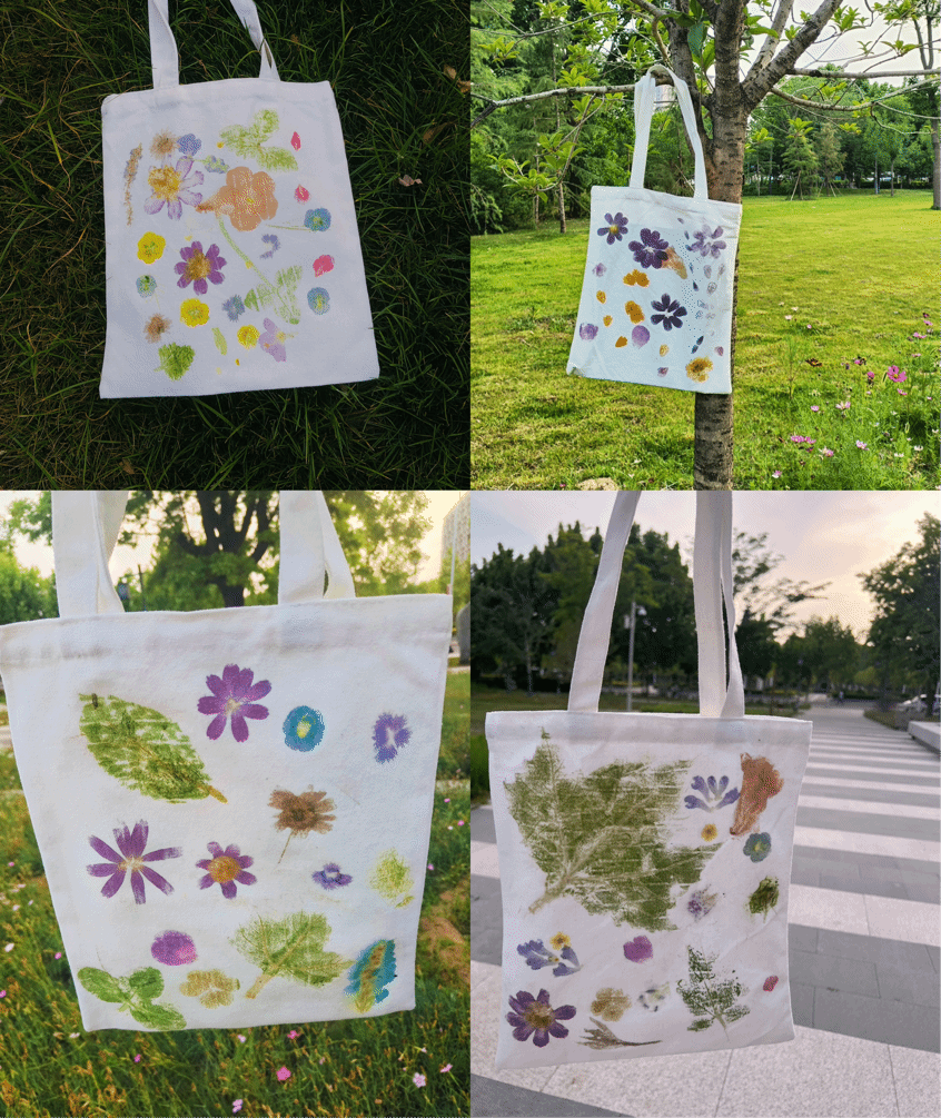 活动伊始,工作人员首先向同学们讲解数十种常见的中草药,包括月见草、紫菀、射干等,并详细讲解其生长环境、药用价值,让同学们对中草药植有更深入的了解。随后,工作人员现场演示中草药拓印的制作过程,指出每个步骤中的关键和注意事项。接下来,同学们纷纷开始动手实践,挑选中草药、精心搭配色彩、不断用锤子敲打,精美的中草药植纹理被拓印至帆布袋上,一件件别具一格的作品展现在眼前。本次活动共制作30余件作品,其中,赵以琳同学的作品大方美观,色彩协调,荣获一等奖。
