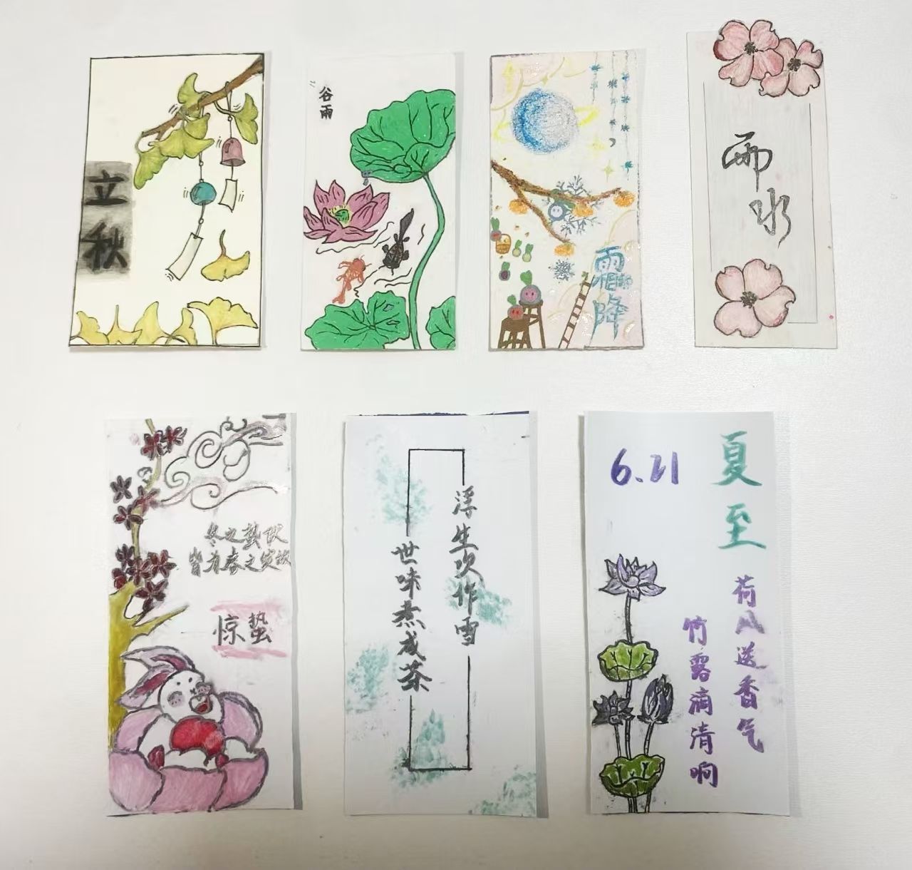 二十四节气与书签的结合,是中国传统文化与同学们日常生活的完美融合,此次活动不仅让同学们对节气有了更加透彻的认知,也让同学们在自己制作的书签中学会顺应自然,与自然相融,与时间共生。