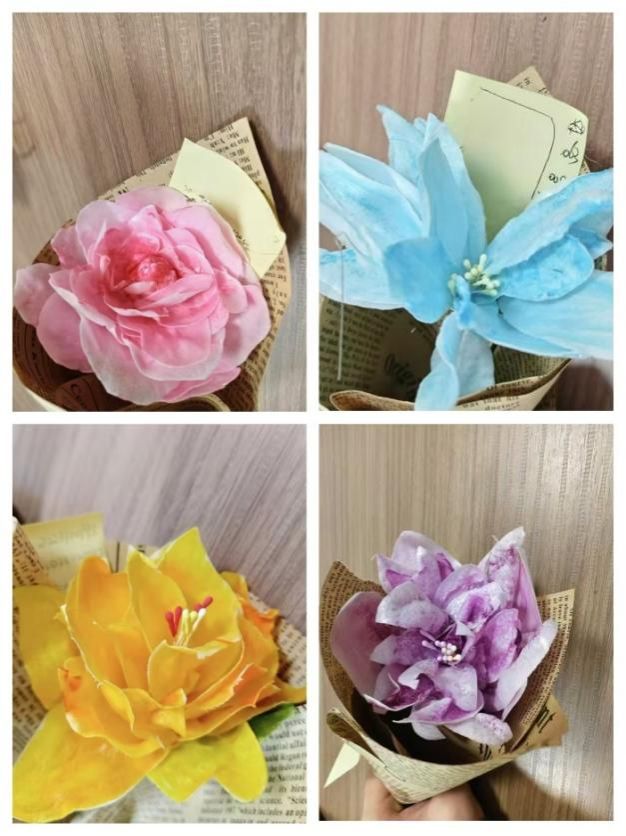 活动伊始,工作人员向同学们介绍纸巾花制作步骤、注意事项等相关内容,各组成员在认真聆听后,共同商讨构思花朵形状、色彩搭配以及制作细节。在制作过程中,有的小组以黄色渲染,创作出一朵耀眼夺目的“金盏菊”;有的则采用蓝色调,塑造了一朵风姿绰约的“蓝莲花”。从一张张白色糯米纸到一朵朵鲜艳夺目的花艺作品,无不透露着同学们的用心和创意。其中刘玉洁、高艺菲、刘晨莹、姜晓彤所组成的小组因作品造型别致,颜色搭配和谐获得第一名。本次活动另设二等奖两组,三等奖两组,优秀奖三组。