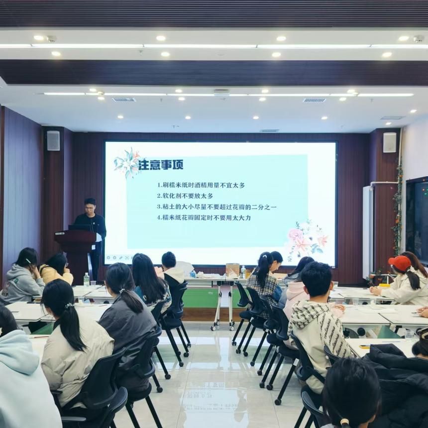 朋辈导师于2024年11月25日在远志学堂举办“花艺时光,慢享生活”手工纸巾花制作活动。本次活动采取小组合作形式,共有近百余名同学参加。
