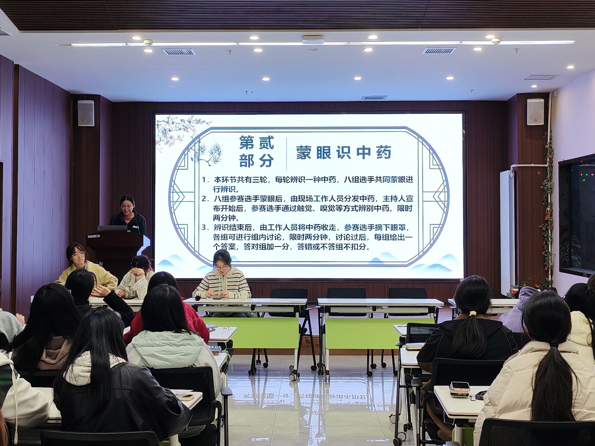 比赛伊始,工作人员详细讲解药材的分类、特征等相关知识,并为每组参赛队伍分发了24味中药实物。同学们对照实物观察,认真记录笔记,为接下来的竞赛环节做好准备。竞赛分为“风采题”、“蒙眼识中药”和“中药材中谁是卧底”三个环节。在风采题环节,同学们轮番上阵,凭借扎实的中药知识和高涨的学习热情,展现出非凡的专业风采。蒙眼识中药环节更是挑战重重,同学们依靠触觉与嗅觉精准辨识药材,展现出色的辨识能力。最后的中药材中谁是卧底环节,同学们化身侦探,通过巧妙的语言描述和逻辑推理,成功识别并投出“卧底”,为比赛增添不少乐趣和悬念。经过激烈的比拼,第三组脱颖而出,荣获一等奖。本次活动另设二等奖二组,三等奖三组。