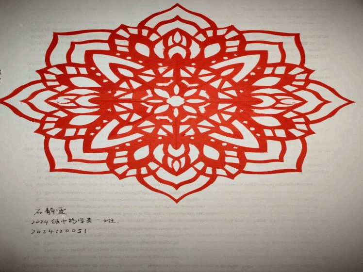 活动中,同学们全神贯注,手持剪刀,翻折红纸,用娴熟的技艺创作出一幅幅别具匠心的剪纸作品。从简单的几何图案到复杂的花鸟鱼虫,每一幅作品都生动诠释了剪纸艺术的独特魅力。一些同学勇于创新,将现代元素融入传统剪纸,为古老艺术赋予了新的生命力。其中,2024级中药学类一班石静雯同学的作品凭借流畅的线条变化和对称构图,完美体现了中国传统文化中对和谐与圆满的追求,荣获一等奖。