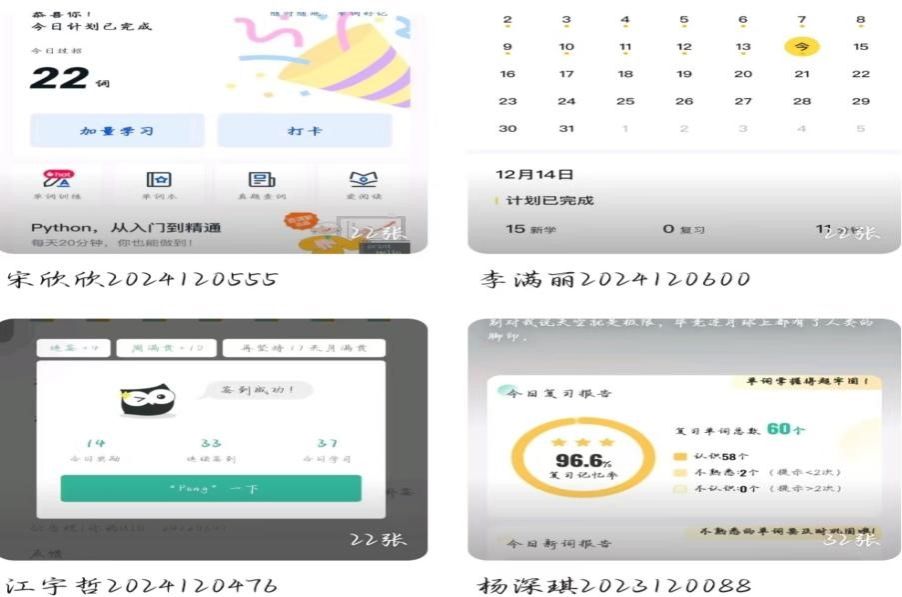 于2024年11月至12月相继开展“一日之计,惟在于晨”阳光晨读、“静心自习,行稳致远”晚间自习室、21天单词打卡活动。在活动中促进同学们提高学习效率,养成自主学习的习惯。